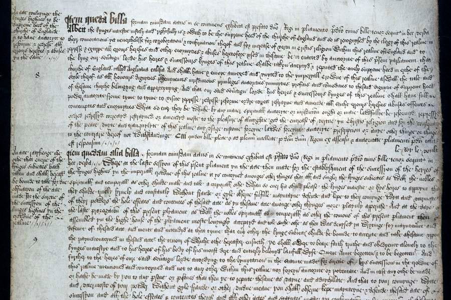Original manuscript of the Act of Supremacy 1534 (C 65/143 m5), showing the opening text in medieval secretary hand on parchment.